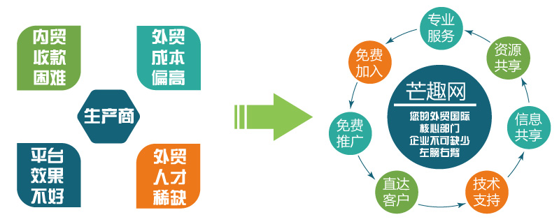 芒趣网帮助中小企业建立完整国际贸易销售渠道,作为企业的核心合作伙伴,外贸国际部门而存在。